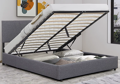 Modern style Queen size bed frame with Dark grey linen headboard and under bed storage. 750Lbs weight capacity. Solid wood slots, steel frame. No box spring required